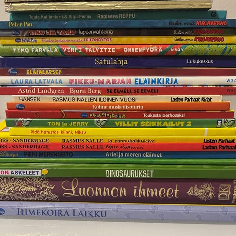Lasten kirjoja kunto vaihtelee kirjan mukaan. Pottapulma ja eläinmaailma 4e/kpl. Muut 2e/kpl.