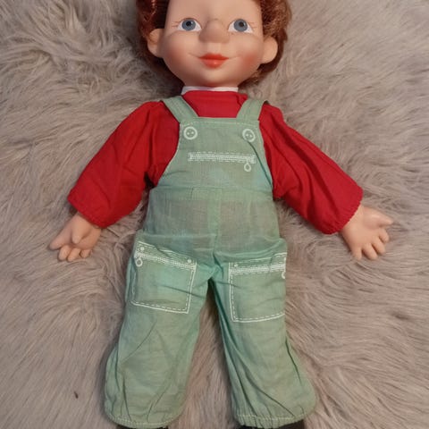 Nukke on muuten hyväkuntoinen, mutta hiukset on takaraivolta hiukan katkeilleet säilytyksessä (kuva). Materiaali on muovia. Nuken korkeus n. 30 cm. Ollut aikanaan vain koristeena hyllyssä.