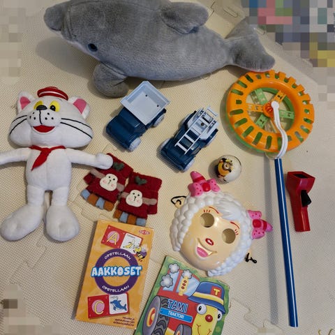 Kuvamukainen lelupaketti. Pehmoleuja, pelejä, askelmittari, glitterväriä ym.