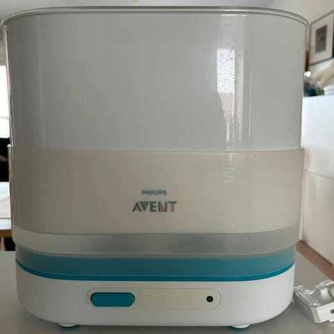 Höyrysterilointilaite. Mahtuu 3 pulloa osineen kerrallaan. Ollut pari vuotta kaapin perukoilla odottamassa jos vielä meille tarvetta tulisi. Toimiva laite