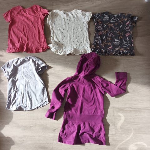 Kuvannäköiset yhdellä lapsella käytössä olleet vaatteet kaikki kokoa 122, vaatteet pesty, ei silitetty, nukkaa ja värikulumaa voi olla, muun mahdollisen ilmoitan jos huomaan. Savuton ja eläimetön koti.
