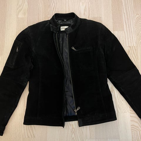 Uudenveroinen musta keinonahkatakki. Takki on lyhyt malli.