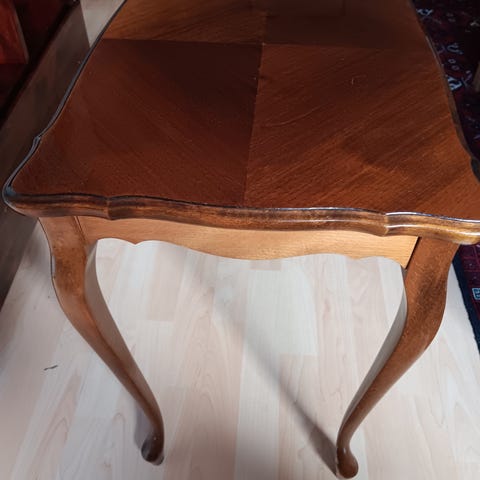Kaunis perulainen puupöytä. Sorvatut jalat, koristeltu pöytälevy, nahkaa. Korkeus 60 cm.