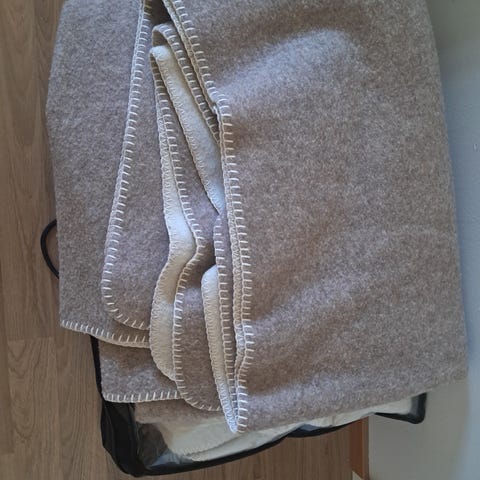 Valko-vihreä iso villapeitto. Kuvissa kaksinkerroin.