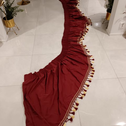 Valmisverho/kappa nauhasomisteella. Pituus !30 sm, leveys 120 sm. Yläkäänne 7 sm ja alakäänne 5 sm. Puuvillaa. Tekstin värit vihreän eri sävyjä ja kukassa violettia ja vihreää. Nauhat 22 sm verhon reunasta. Hyvä kunto.