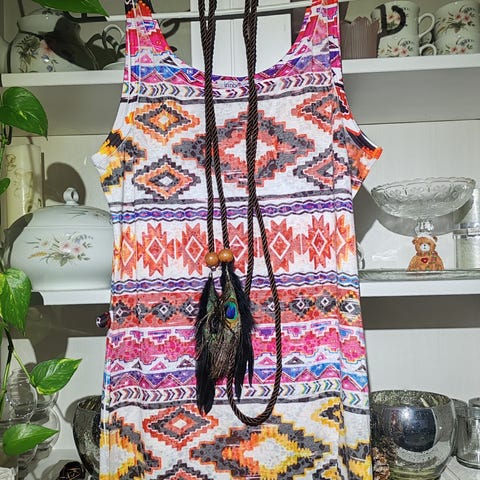Niin söpö printti! Mallina ei kiristävä eikä tyköistuva vaan suora ja rento malli. Takana nappikiinnitys.