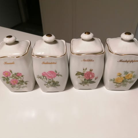 Retro mausteikko Tanskanmaalta, jotain jaloa puuta (ruusupuu?), sinappipurkki keramiikkaa. Purkkien korkeudet 55-62 mm ja telineen halkaisija 13 cm.