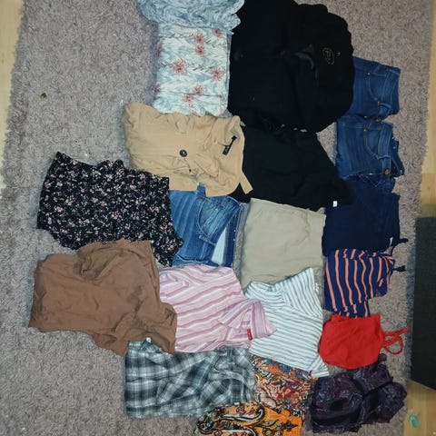 Omasta käytöstä poistettavia vaatteita M tai L -kokoisia. Puhtaita ja siistejä. Osa käyttämättömiä.