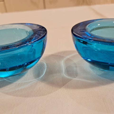 2 kpl Iittalan Ballo-tuikkualustoja. Väri sininen. Design: Anna Leena Hakatie. korkeus n. 4,5cm, halkaisija n. 9,5cm, molemmissa alkuperäinen i-tarra ja laatikko tallella.