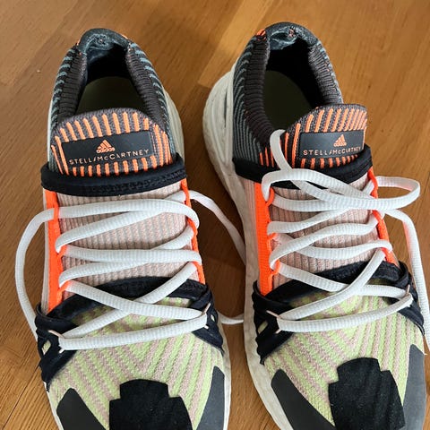 Myydään upeat Adidas by Stella McCartney lenkkarit. Kokomerkintä 40, mutta ovat sopivammat 39 jalkaan. Kengät ovat tummansiniset neonoransseilla tehosteilla, vaaleat osat hohtavat pimeässä. Olleet vähäisessä käytössä ja kunto näin ollen oikein hyvä.