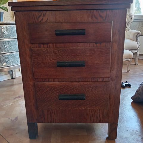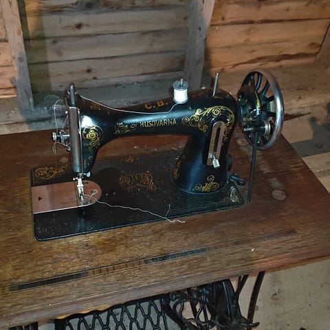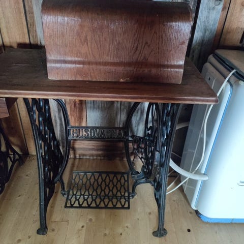 Vanha Husqvarna ompelukone. Pöytä ja laatikot ehjät, puupinnat kuluneet. Peltinen ompelutarvikelaatikko muutamine tarvikkeineen. 50 EUR.