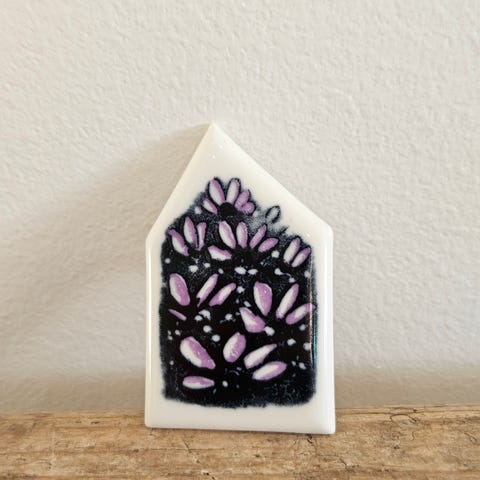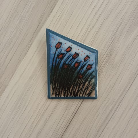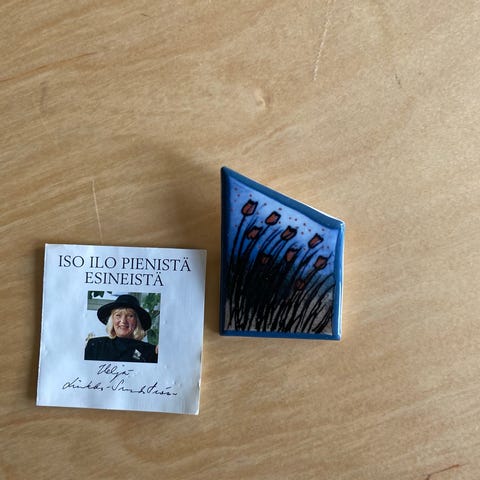 Myydään kaunis Arabia Heljä Liukko-Sundströmin rintakoru Iltaruskon kukat. Korkeus 6,3 cm, leveys 4,5 cm. Signeerattu. Kunto uudenveroinen.