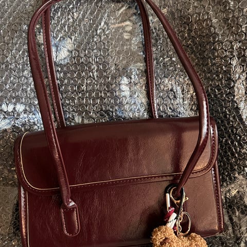 Karkkipapereista ja etiketeistä käsintehty käsilaukku, jossa rannelenkki ja vetoketju.