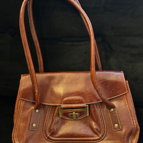 Giudin italialainen nahkalaukku. Kaksi vetokeljullista lokeroa, joista toisessa vetoketjullinen sivutasku. Hihnan pituus enimmillään noin 2 metriä. Korkeus 17 cm, leveys alhaalta 25 cm, leveys ylhäältä 23 cm. Kilossa. MMM.