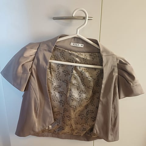 Kermanvalkoinen Vilan juhlabolero ja hakaneulakiinnitteinen ruusuke. Oikean kainalon vuoressa reikä, mutta ei näy ulospäin. Etumuksessa lisäksi ihan pieni langanpurkauma.
