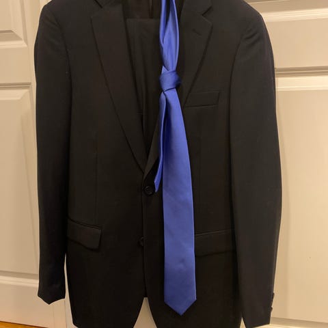 Uuden veroinen puku. Yhdet rippijuhlat pidetty. Takki 48 short. Housut vyötärö 30 lahje 32. Ovh 299€