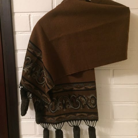 Lämpimänsävyinen kolmiohuivi. 140 x 110 x 110 cm + hapsut.