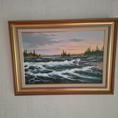 Kevättalvinen koskimaisema, koko alkuperäisine kehyksineen 41 x 34 cm.