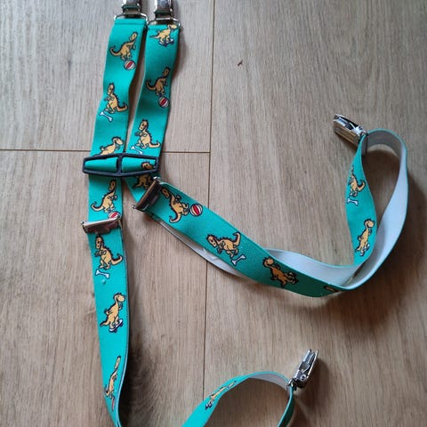 Lasten henkselit tai olkaimet, pomp de lux. Henkselien pisin kokonaismitta on noin 76cm. Kuvan siniset henkselit jäljellä, ruskeat myyty. Käyttämättömät. Hinta 10e noudettuna. Postitettuna +6,90e xxs-pakettina.