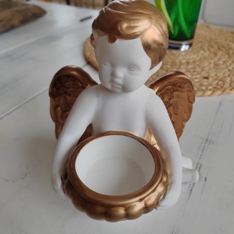 Myydään siisti ja hyväkuntoinen enkelikoriste tuikkiville kynttilöille.