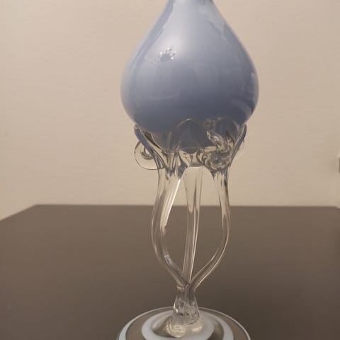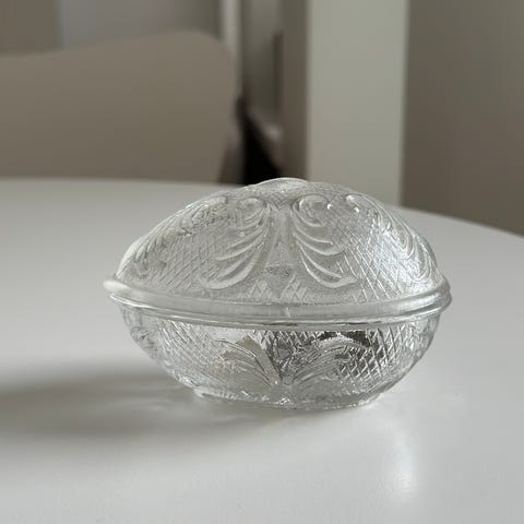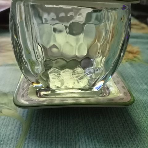 Kaunis hopeansävyinen lasirasia, korkeus kannella noin 15 cm ja halkaisija 15 cm. Ehjä ja hyväkuntoinen. Vain koristeena ollut.