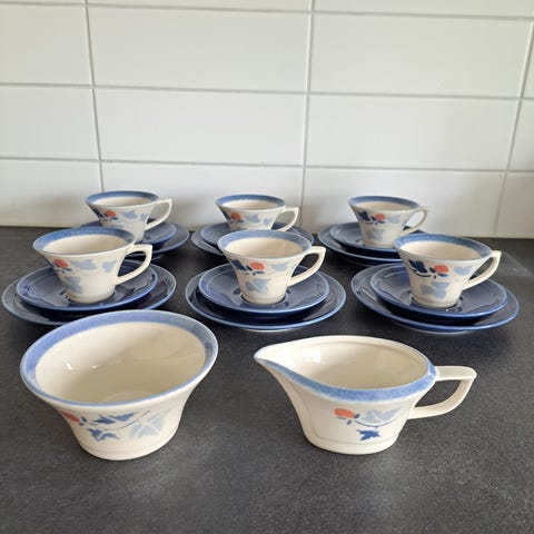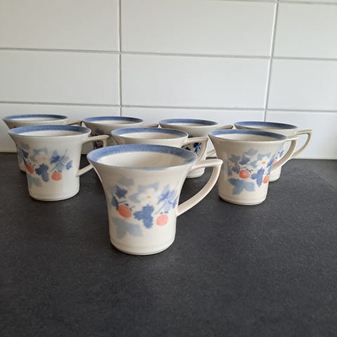 Otsikon mukaiset Pentikin Mansikka kahvikupit ja pullalautaset. 4 settiä.