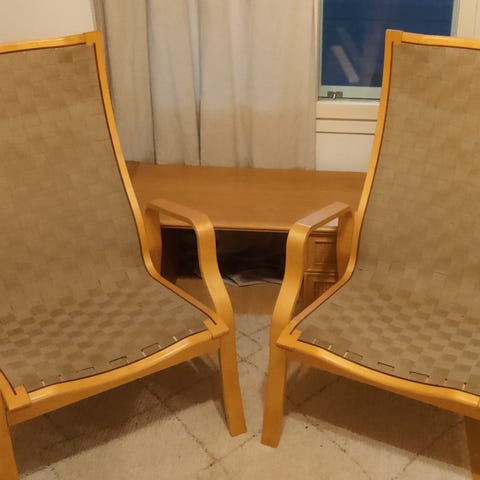 Uudet hyväkuntoiset tuolit, harmaalla kangasverhoilulla.
