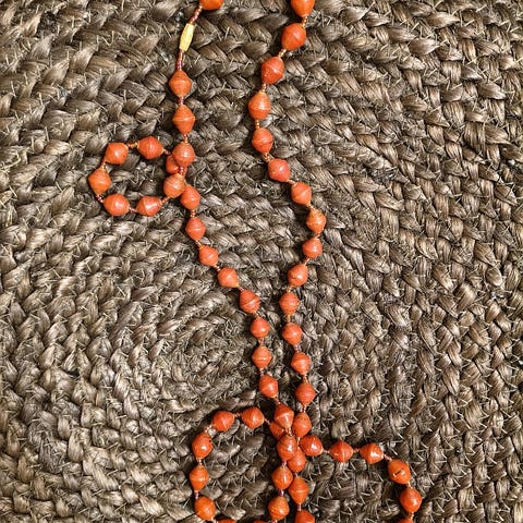 Mustavalkoinen käsintehty helmikaulakoru siemenhelmistä, ympyrän halk.n.4.5cm, kaulanauhan pituus 62cm, hapsujen pituus 4.5cm.
