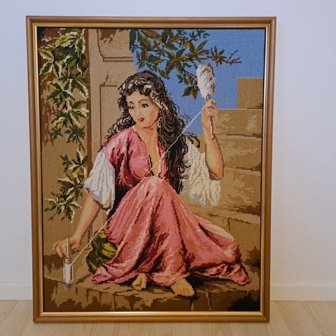 Kanavatyö taulu Kehrääjänainen