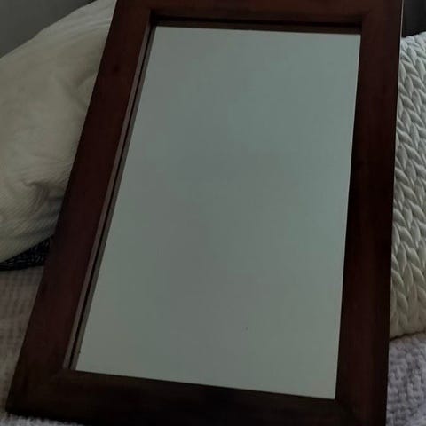 Längenmallinen upea peili, kehys petsattua, lakattua tai maalattua tervaleppää.