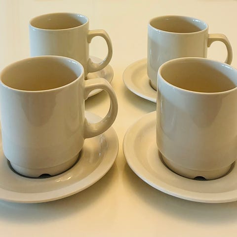 Hyväkuntoiset valkoiset kahvikupit ja lautaset. Ei säröjä. Leimoissa kulumaa.