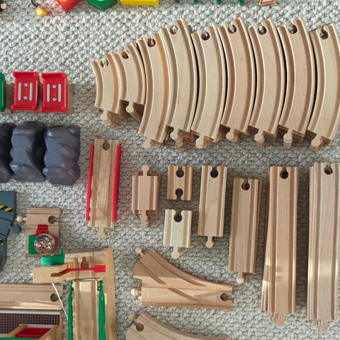 Puinen junarata, jossa mukana junia, autoja, liikennemerkkejä yms. Hyväkuntoinen.