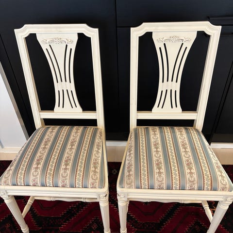 2 kpl Kustavilaisia tuoleja joista toinen on kunnostettu ja toinen alkuperäiskuntoinen.
