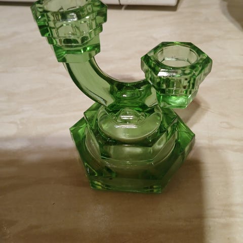 Hyväkuntoinen lasinen hevosenkenkä- kynttilänjalka. Korkeus n. 19,5cm