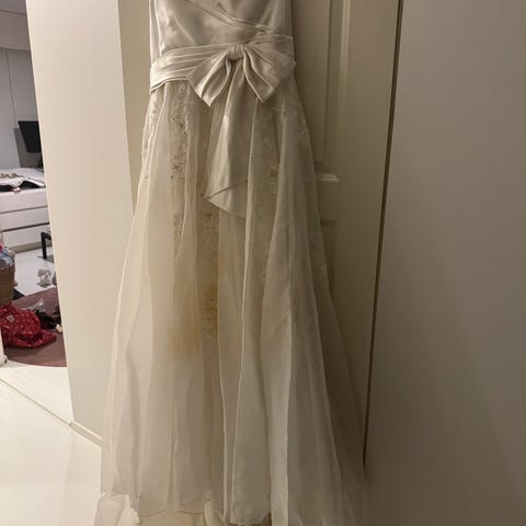 Mittatilauksena Helsingissä valmistettu hääpuku koossa 38. Ollut käytössä kahdella morsiamella (itse olen se toinen ja olen 167 cm pitkä). Väri luonnonvalkoinen. Häiden jälkeen pesetetty. Ehjä ja siisti. Kiva, rento malli!
