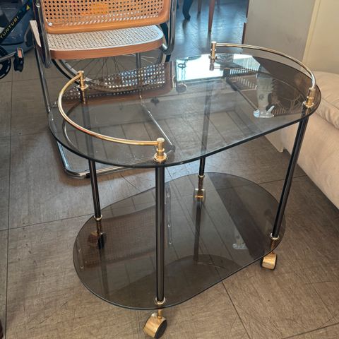 Kuvan mukainen tarjoiluvaunu! Ajan tuomaa patinaa ja kulumaa .Pöydän pinnassa on muovikalvo kuvio. Korkeus 69cm, pituus 71 cm ja leveys47 cm. Vain nouto.
