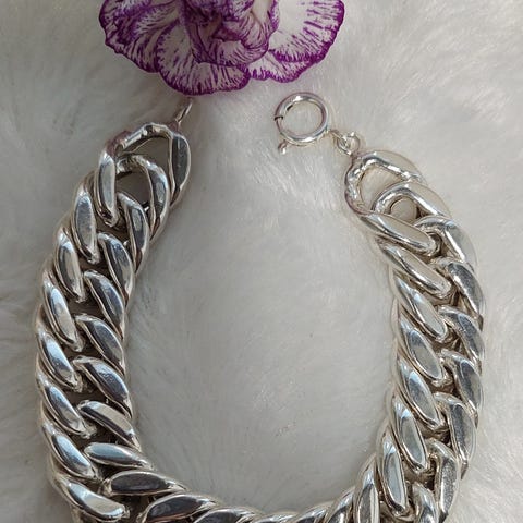 Hopeinen, leveä ja paksu vintage ranneketju onnenamuleteilla. Ketjun pituus n. 19cm ja leveys n. 8mm. Leimat S, kolme kruunua, 835, kolmio. Myös ketjun toisen pään lenkissä 835. Amulettien lenkit juotettu, eli alkuperäiset. Vuosikymmenet laatikossa säilössä ollut tämä upea ketju.