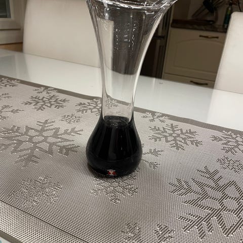 Lasistudio Viasettin käsintehty erikoinen lasimaljakko. Näitä ei tule joka päivä vastaan! Kauniin punainen pohja, läpinäkyvä yläosa. Korkeus n. 17 cm.