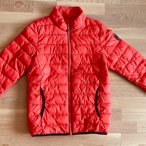 Kevyttoppatakki, ruskean oranssi, ei niin kirkas mitä ehkä kuvissa näyttää. Hupun saa myös kätevästi ketovetjulla piiloon. Väljän mallinen. Kainalo-kainalo noin 45cm ja kainalo-helma noin 40cm.