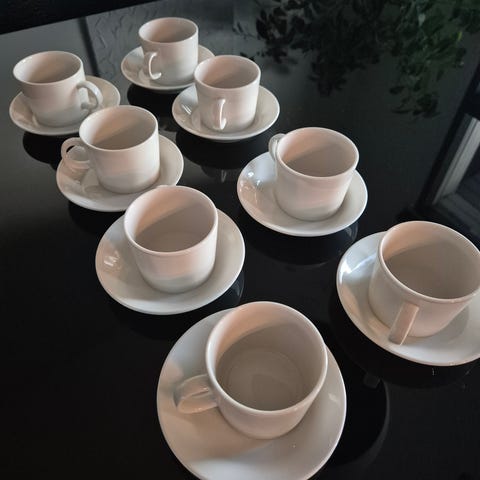 Teema-sarjan kahvikupit ja alulautaset, 5 kpl. Pientä käyttökulumaa, mutta muuten kunto hyvä, ks. kuvat. Kupin korkeus 5,5 cm, halkaisija 7,3 cm. Alulautasen halkaisija 12,3 cm. Nouto tai lähetys.