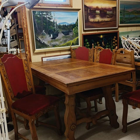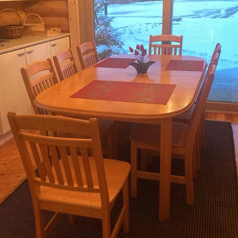 6 hengen ruokapöytä ja 6 tuolia. Siistit tuolit ja pöytä. Tuolien verhoilun väri on vihreä, kuva vääristää. Pöydässä jonkin verran kulumaa, hiomalla ja lakkaamalla saa oikein siistin. Voidaan myydä myös erikseen.