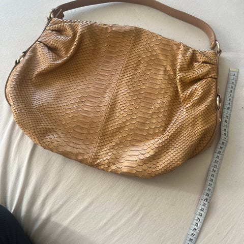 Furlan nahkalaukku on vaaleanruskean/taupen sävyinen. Ulkopuolella tasku ja sisällä vetoketjullinen tasku. Reilun kokoinen. Leveys 33cm, korkeus 30cm ja syvyys 9cm.