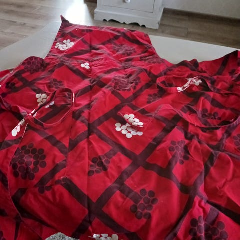 Marimekon käyttämättömäksi jäänyt esiliina. Näissä ei kokoa ole erikseen määritelty. Mitat ovat seuraavat: LEV 82 cm, PIT 84 cm. Mahtuu kirjekuoreen.