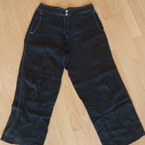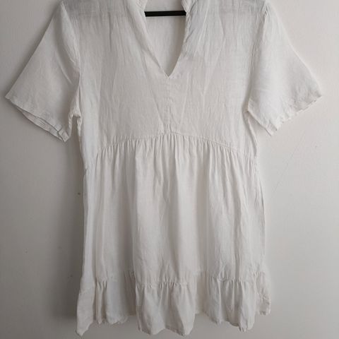 Sininen paita, jossa valkoisia pallokuvioita. Materiaali 100% pellavaa. Made in Italy. Kokomerkintä puuttuu. Sanoisin, että paita sopisi parhaiten S- tai M-kokoiselle. Leveys kainalosta kainaloon noin 52 cm. Pituus niskasta helmaan noin 67 cm. Hyväkuntoinen, tosin hiukan kaapissa rypistynyt.