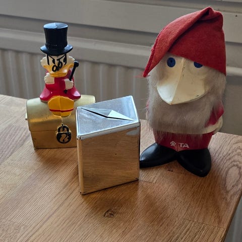 Hauska kirkkaanvärinen posliininen koriste-esine, joka on tuotetietojen mukaan tarkoitettu säästölippaaksi. Hahmon suussa on aukko, josta hahmon sisään voi pujottaa esim. seteleitä. Pohjassa on silikoninen suojus, jonka irrottamalla sisuksen voi tyhjentää. Hahmon kädet ovat joustavaa vieteriä ja jäävät hetkeksi heilumaan, kun hahmoa liikuttaa. Koriste-esine on täysin uusi ja sitä on pidetty huolellisesti pakattuna. Esine on siis samassa kunnossa kuin ostaessa. Silikoninen suojus ei ole kovin tukeva, joten itse en välttämättä laittaisi hahmon sisään mitään painavaa (esim. paljon kolikoita). Esine toimiikin ehkä parhaiten piristävänä koristeena. Hahmon korkeus on noin 14 cm.