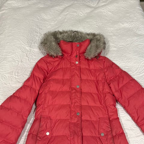 Nätti, osittain untuvatäytteinen kevyt takki kevääseen. Hihat sisäpuolelta harjattu eli fleeceä. Hihat ei ole tuulenpitävät, muuten suojaa tuulelta. Irroitettava huppu. Pidetty, mutta kunto siisti ja hyvä. Hihoissa hieman nukkaa, näkyy kuvassa eikä näy käytössä häiritsevästi.