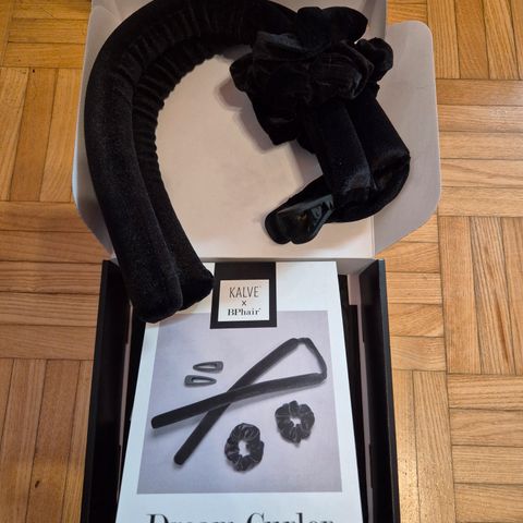 Myydään uusi kiharruspaketti, jossa kaksi kiharruspatukkaa, neljä renksua ja kaksi hiuspinniä.