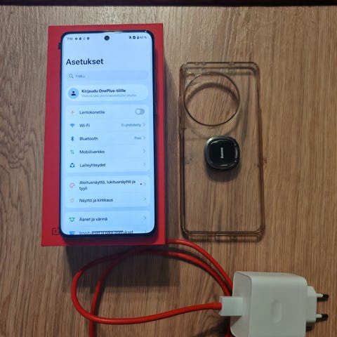 Käytetty, ei suojakalvoa, pieniä naarmuja näytössä, eivät näy kuin kirkasta valoa vasten etsimällä. Mukaan sandstone- ja silikoni-caset. Supervooc laturi lisähinnasta.