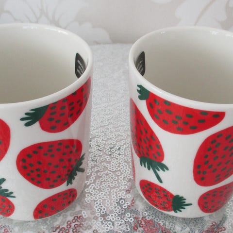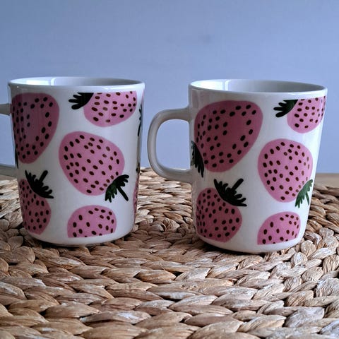 Ihanat ja uudet tarralliset Marimekko mansikka sarjan mukit. Koko on 2,5 dl. Hinta on 43 e/kpl, myynnissä neljä kappaletta. Hinta jo tingitty, kiitos. Postitus onnistuu ostajan piikkiin ja nouto käy. Tori diili ei käytössä.