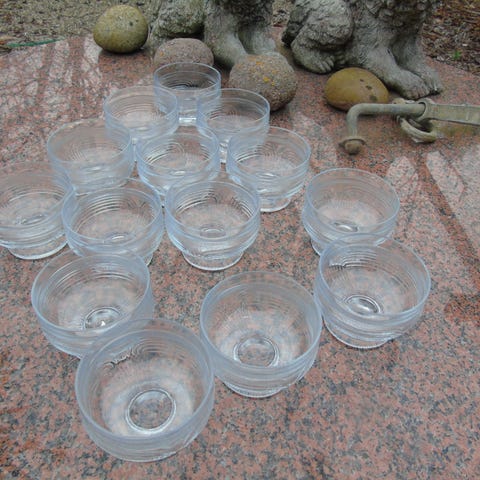 Riihimäen lasin vallan priimakuntoiset vailla käytön jälkiä kirkkaan puhtaat jalallinen jälkiruokakulho Domina 1980 luvulta 4 kpl. Täysin ehjät eikä käytön jälkiä. Riihimäen Hans Nyqvist suunnittelua. Korkeus 7,5 cm; halkaisija suu 10,3 cm ja jalka 7,4 cm. Myydään kaikki yhdessä, hinta yhteensä.